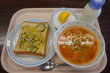 今日の給食:ツナトースト ミネストローネ 柿 牛乳
