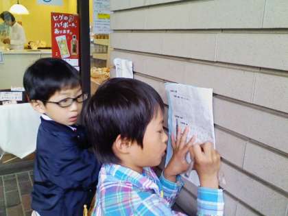 かべを机に熱心にまとめています。