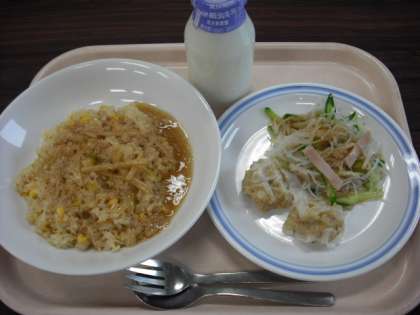 12月18日の給食 公開日 2013/12/18 更新日 2013/12/18 八雲ランチ 今日の給食:あんかけチャーハン 豆腐シューマイ 中華風サラダ 牛乳 産地 大根:東京都 にんじん:東京都 長ねぎ:東京都 白菜:東京都 しょうが:高知県 玉葱:北海道 きゅうり:宮崎県 もやし:栃木県 鶏肉:徳島県 いいね(0)