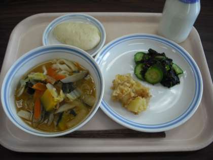 今日の給食:ほうとう せいだのたまじ きゅうりとわかめの酢の物