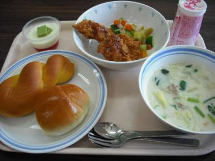 今日の給食:バターロール パンプキンパン シチュー パリパリチキン