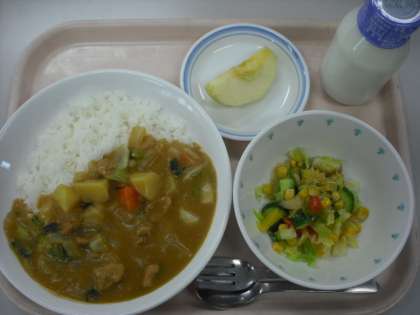 今日の給食:冬野菜カレーライス カラフルサラダ りんご 牛乳