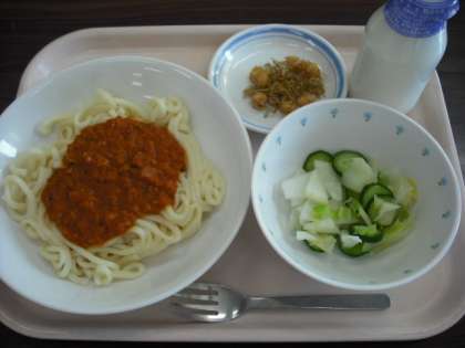 今日の給食:スパゲティミートソース 大根サラダ