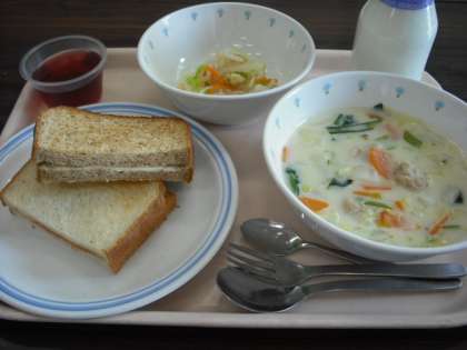 1月28日の給食 公開日 2014/01/29 更新日 2014/01/29 八雲ランチ 今日の給食:二色サンド 野菜のクリームスープ パステルサラダ ブドウゼリー 牛乳 産地 玉ねぎ:北海道 にんじん:千葉県 白菜:和歌山県 小松菜:埼玉県 大根:神奈川県 キャベツ:神奈川県 豚肉:岩手県 いいね(0)