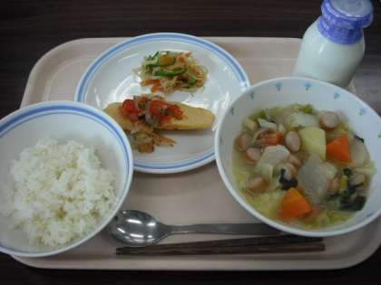 今日の給食:ごはん 魚のエスカベージュ ポトフ ゆで野菜レモン醤油 牛乳