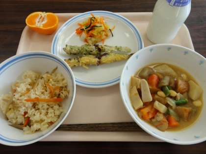 今日の給食:炊き込みご飯 筑前煮 ししゃもの二色揚げ