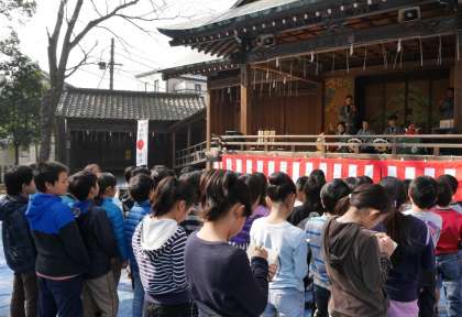 社会科「昔から続いている目黒囃子」 公開日 2014/02/04 更新日 2014/02/04 3年 今日は節分です。学校裏の氷川神社で、午前から目黒囃子を演奏していました。 ちょうど社会科の学習で調べ学習をするところです。古くから続いている区の無形文化財を実際に見て、たくさんのことをメモしていました。 いいね(0)
