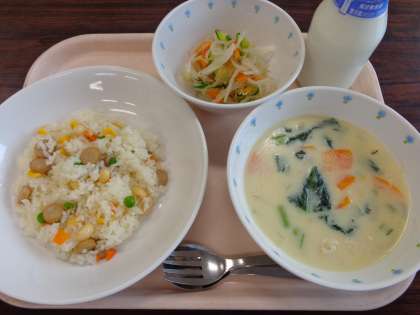 5月15日の給食 公開日 2014/05/16 更新日 2014/05/16 八雲ランチ 今日の給食:大豆ピラフ ほたてのチャウダー こんにゃくサラダ 牛乳 産地 玉ねぎ:佐賀県 にんじん:徳島県 小松菜:東京都 もやし:栃木県 きゅうり:宮崎県 かぶ:千葉県 鶏肉:徳島県 いいね(0)