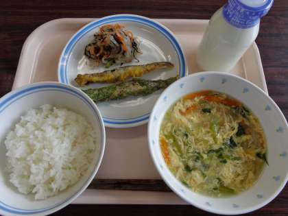 6月4日の給食 公開日 2014/06/04 更新日 2014/06/04 八雲ランチ 今日の給食:ごはん かき玉汁 ししゃもの二色揚げ 大根とひじきのサラダ 牛乳 産地 大根:千葉県 にんじん:徳島県 きゅうり:宮崎県 長ねぎ:埼玉県 玉ねぎ:佐賀県 小松菜:埼玉県 三つ葉:静岡県 ししゃも:ノルウェー いいね(0)