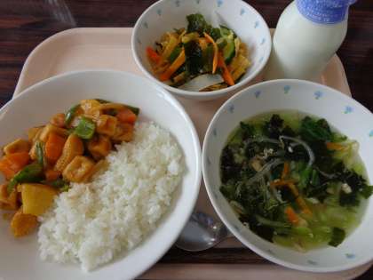 今日の給食:ごはん チンゲン菜とワカメのスープ パリパリサラダ 牛乳