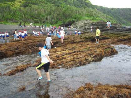 今日から大潮で干潮は9時半。磯観察には絶好の潮加減ですが、残念ながら曇り空。しかし子どもたちは小魚やカニ、ウミウシなどを捕獲し、歓声を上げていました。