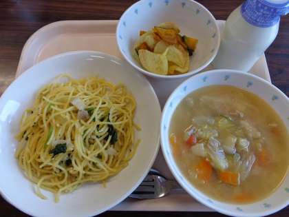 今日の給食:ペペロンチーノスパゲティ ペペスープ イグナムチップス 牛乳