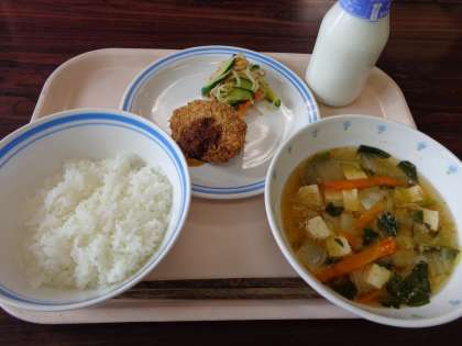 今日の給食:ごはん みそ汁 キャベツメンチ ゆでやさいしょうが和え 牛乳