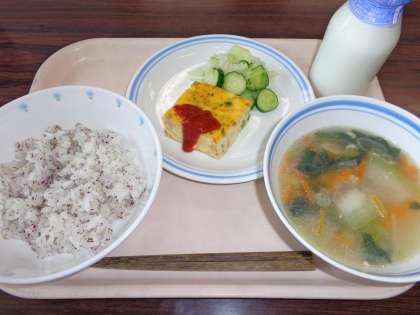 今日の給食:ゆかりごはん 冬瓜とひき肉のスープ チーズオムレツ