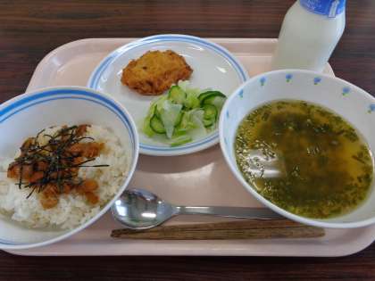 今日の給食:ひつまぶし風 手作りさつま揚げ 大根サラダ 牛乳