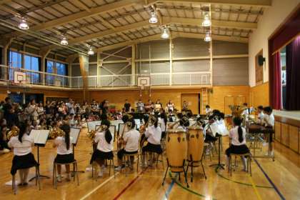 オープニングイベントの八雲小金管バンドの演奏は、途中で雨のため中断し、