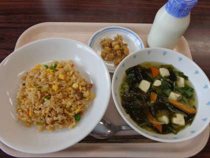 8月27日の給食 公開日 2014/08/27 更新日 2014/08/27 八雲ランチ 今日の給食:キムチチャーハン チンゲン菜とわかめのスープ 大豆とじゃこのかりかり揚げ 牛乳 産地 にんじん:北海道 長ねぎ:新潟県 玉ねぎ:北海道 チンゲン菜:静岡県 豚肉:岩手県 いいね(0)