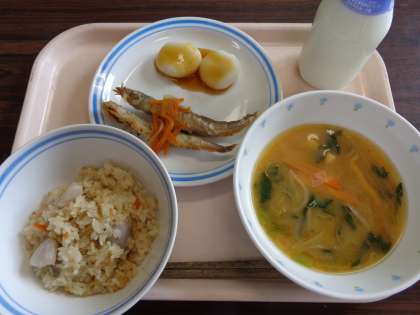 9月5日の給食 公開日 2014/09/05 更新日 2014/09/05 八雲ランチ 今日の給食:里芋ごはん みそ汁 ししゃもの南蛮漬け 月見だんご 牛乳 産地 里芋:宮崎県 にんじん:北海道 玉ねぎ:北海道 小松菜:埼玉県 長ねぎ:青森県 もやし:栃木県 鶏肉:鹿児島県 ししゃも:ノルウェー いいね(0)