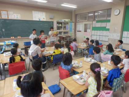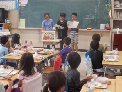 お昼の紙芝居 公開日 2014/09/25 更新日 2014/09/25 今日のできごと 給食委員会の5・6年生が、給食の時間に紙芝居をしに各教室を回ります。 1年生は、食べる手を止めて、紙芝居の世界に引き込まれていました。 お話は「めぐろのさんま」です。 いいね(0)