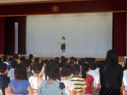 始業式では、校長先生の話の後、6年生による児童代表の言葉、校歌斉唱と続きました。