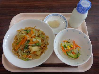 今日の給食:海鮮焼きそば ゆで野菜ごまドレッシング 梨 牛乳