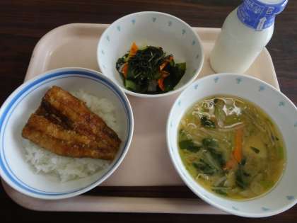 今日の給食:さんまのかば焼き丼 みそ汁 和風サラダ 牛乳