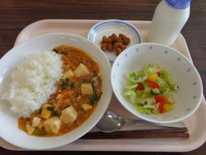 今日の給食:ごはん 西湖豆腐 カラフルサラダ 大豆の黒糖がらめ 牛乳