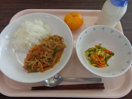 今日の給食:ごはん 回鍋肉 ゆで野菜レモン醤油和え みかん 牛乳
