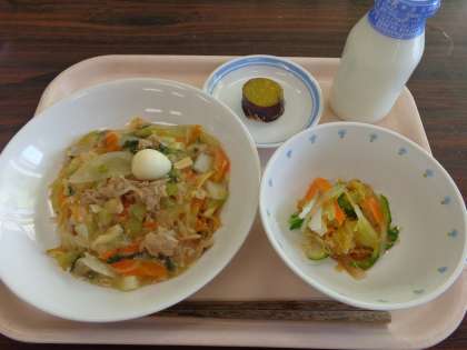 今日の給食:あんかけ焼きそば かみかみサラダ シナモンポテト 牛乳