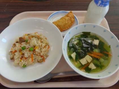 11月19日の給食 公開日 2014/11/19 更新日 2014/11/19 八雲ランチ 今日の給食:鶏ごぼうチャーハン チンゲン菜とわかめのスープ ツナぎょうざ 牛乳 産地 ごぼう:青森県 にんじん:千葉県 玉ねぎ:北海道 チンゲン菜:千葉県 大根:東京都 パセリ:千葉県 鶏肉:徳島県 いいね(0)