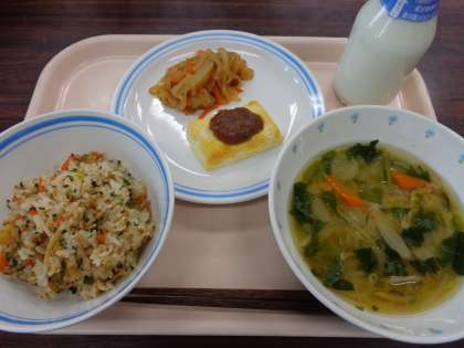 11月28日の給食 公開日 2014/11/29 更新日 2014/11/29 八雲ランチ 今日の給食:さばめし みそ汁 豆腐焼き すろっぽ 牛乳 産地 しょうが:高知県 万能ねぎ:福岡県 小松菜:埼玉県 玉ねぎ:北海道 ごぼう:青森県 白菜:長野県 長ねぎ:千葉県 三つ葉:静岡県 もやし:栃木県 にんじん:東京都 大根:神奈川県 鶏卵:秋田県 さば:九州 いいね(0)