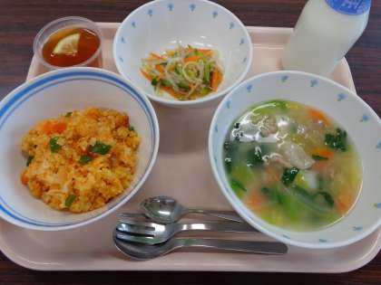 今日の給食:ジャンバラヤ 野菜スープ もやしのサラダ 紅茶ゼリー 牛乳