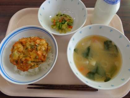 今日の給食:かきあげ丼 みそ汁 野菜の梅ごまだれ 牛乳