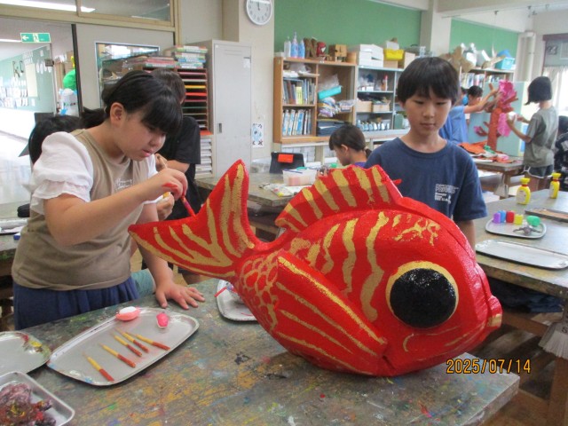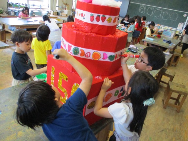 御神輿・山車は図工の時間だけでなく、休み時間も使ってみんなで作りました。