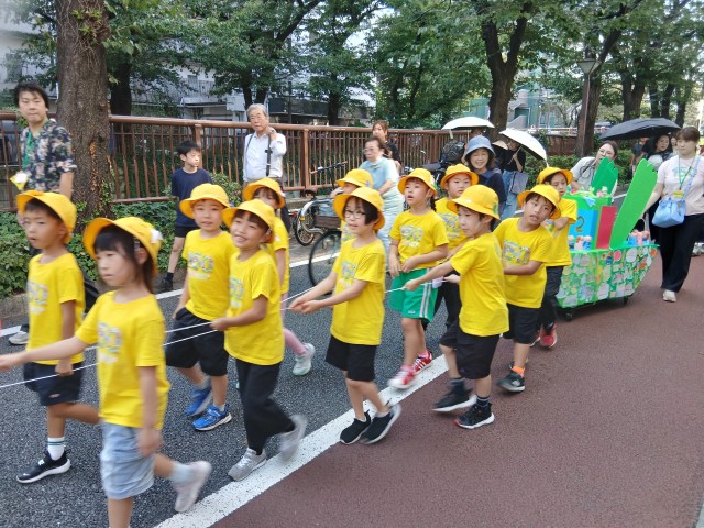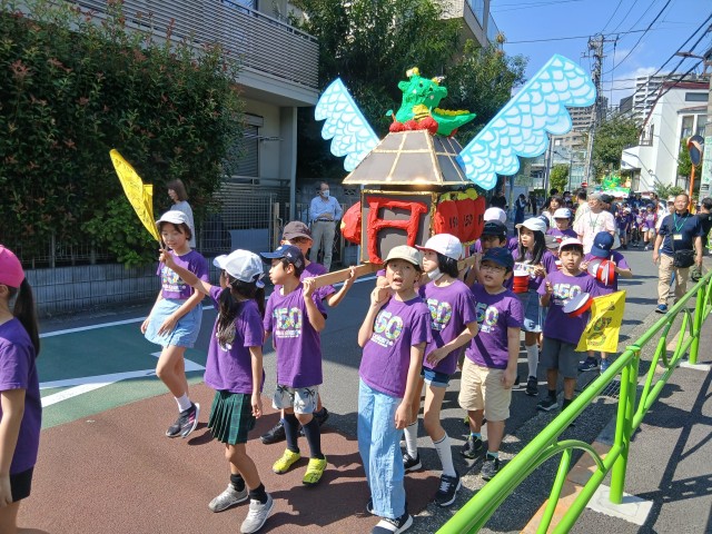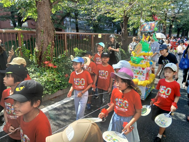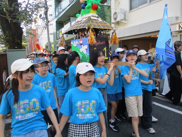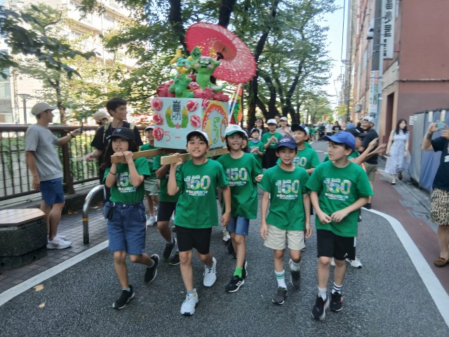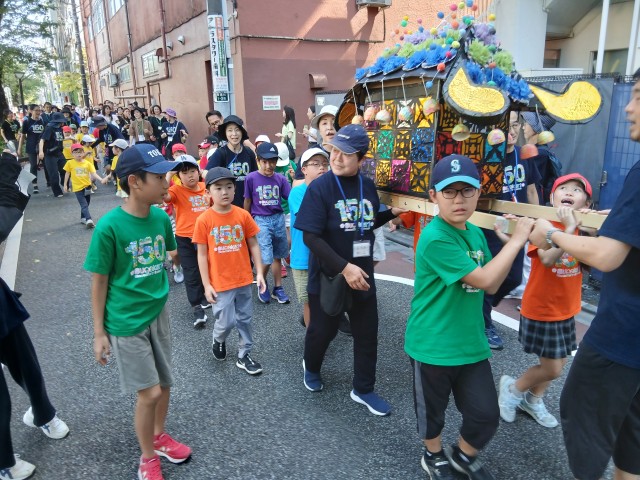 150周年をお祝いして、クラスごとに子どもたちが心を込めて作った御神輿と山車で菅刈の町を練り歩きました。