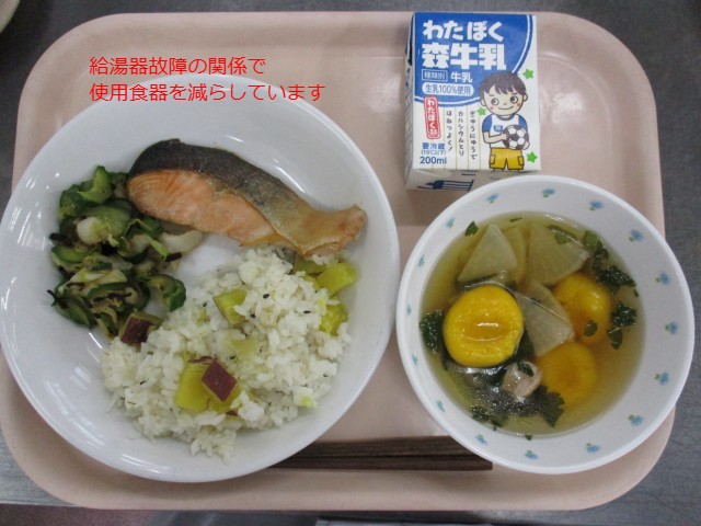 10月6日 さつまいもごはん 月見団子汁 鮭の照り焼き 塩昆布和え 牛乳