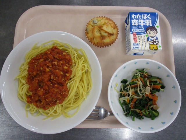 10月7日 スパゲティヘルシーミートソース ほうれん草のサラダ りんごとさつま芋のケーキ 牛乳