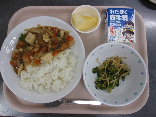 10月22日 麦ごはん 豆腐とえびのうま煮 野菜のごましょうゆ和え りんご 牛乳