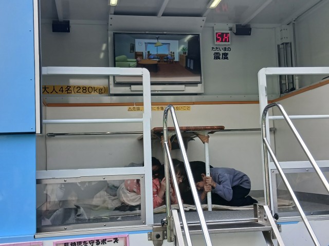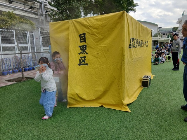 全員の避難が終わった後、4年生は起震車体験、1年生は煙ハウス体験をしました。
