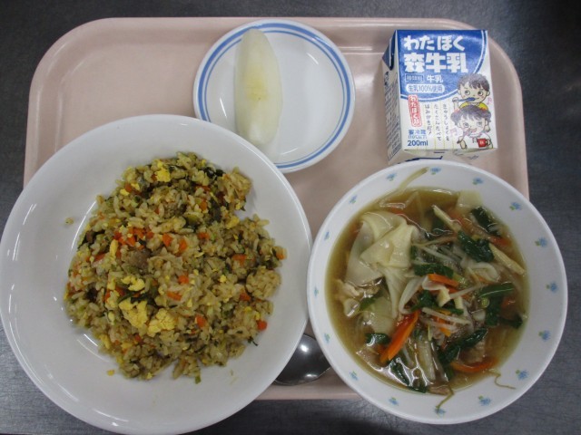 10月30日 高菜チャーハン ワンタンスープ 梨 牛乳