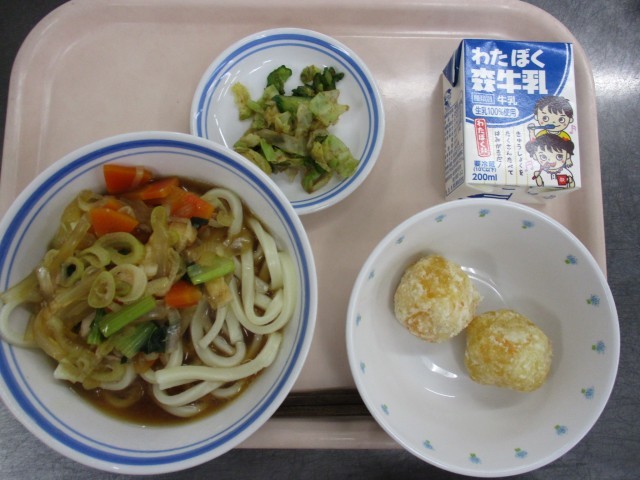 11月11日 鶏南ばんうどん じゃがまる きゅうりとキャベツの土佐漬け 牛乳