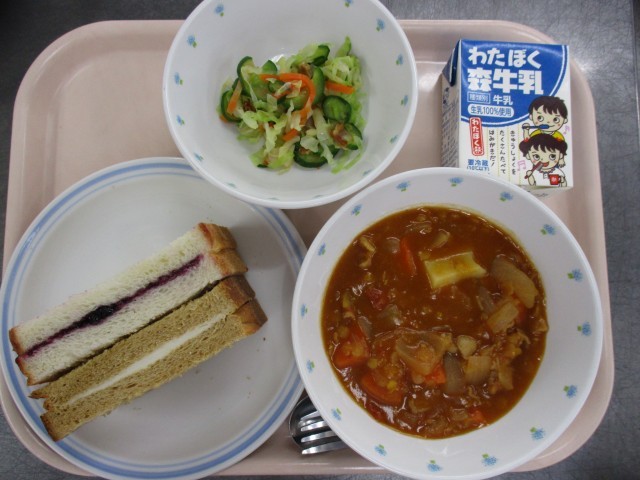 11月14日 二色サンド ポークシチュー キャベツのサラダ 牛乳 公開日 2025/11/17 更新日 2025/11/17 給食 ≪献立≫●二色サンド●ポークシチュー●キャベツのサラダ●牛乳≪使用食材・産地≫にんにく(青森)、セロリ(長野)、玉ねぎ(北海道)、にんじん(北海道)、じゃがいも(北海道)、きゅうり(宮崎)、キャベツ(茨城)、豚肉(埼玉)、レモン(愛媛) いいね(0)