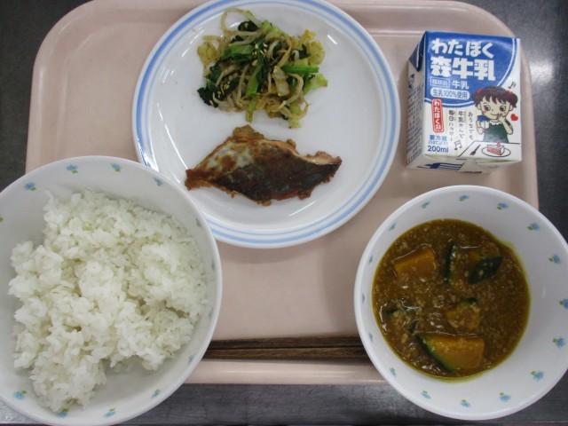 12月19日 麦ごはん かぼちゃのそぼろ煮 さわらのゆずみそ焼き ごまおひたし 牛乳