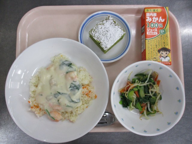 12月24日 エビクリームライス 小松菜ともやしのサラダ 抹茶ケーキ ミカンジュース