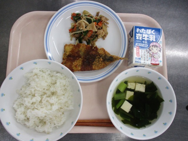 1月19日 麦ごはん すまし汁 いわしフライ 豚肉と野菜のみそ炒め 牛乳