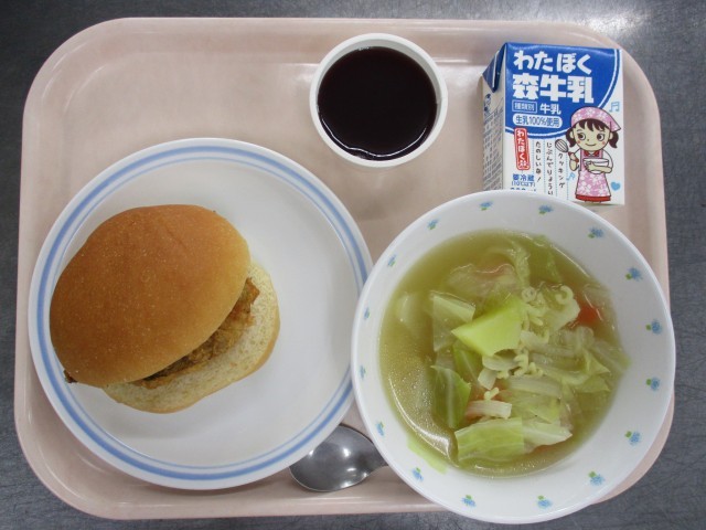 1月22日 フィッシュバーガー ABC野菜スープ ぶどうゼリー 牛乳 公開日 2026/01/23 更新日 2026/01/23 給食 ≪献立≫●フィッシュバーガー●ABC野菜スープ●りんご●牛乳≪使用食材・産地≫セロリ(愛知)、玉ねぎ(北海道)、にんじん(千葉)、じゃが芋(長野)、キャベツ(愛知)、鶏肉(宮崎)、たら(アメリカ) いいね(0)