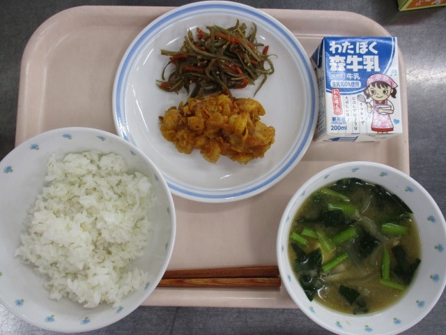 1月23日 麦ごはん 小松菜のみそ汁 パリパリチキン 金平ごぼう 牛乳