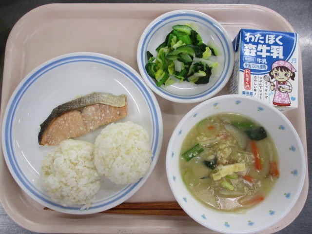 1月26日 玄米入り塩おにぎり 呉汁 鮭の塩焼き 即席漬け 牛乳