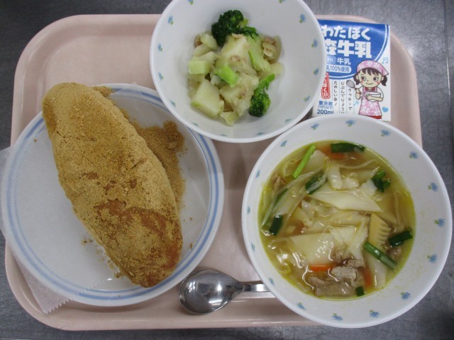 1月28日 きなこあげパン ワンタンスープ じゃが芋とブロッコリーのソテー 牛乳
