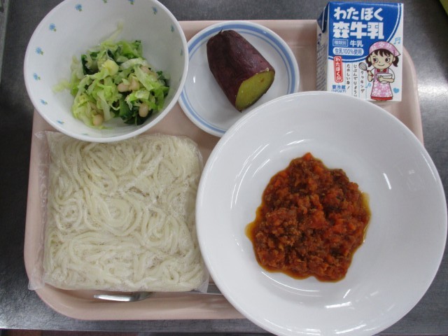 1月29日 ソフト麺 ミートソース 豆入りサラダ 焼き芋 牛乳
